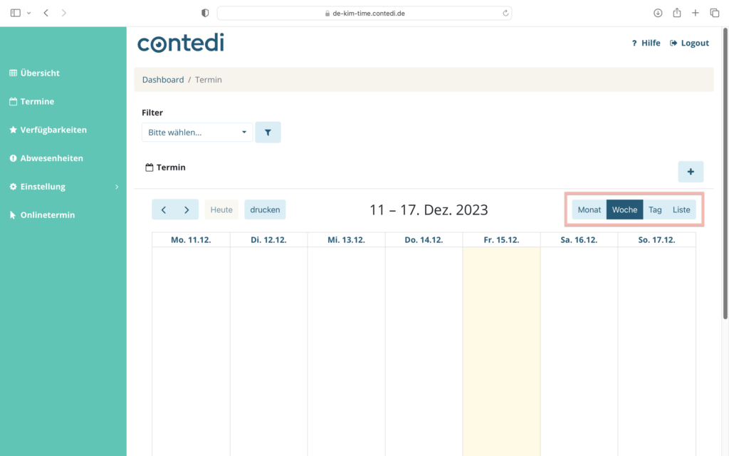 Durch klicken der gewünschten Option erschein Ihnen der Kalender in der Monats-, Wochen-, oder Tagesansicht